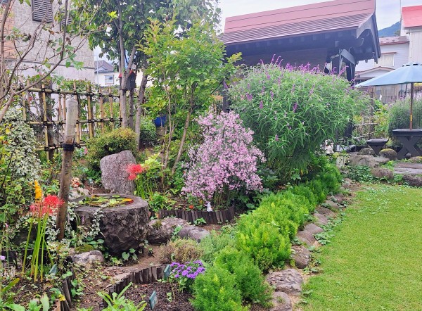 我が家の庭は秋色に変わり、金木犀の香りが漂い、真紅のヒガンバナが緑の芝生に映え美しく咲き、ピンキーウィンキーが秋色に変わり、シュウカイドウや深紅のミズヒキが咲いております。