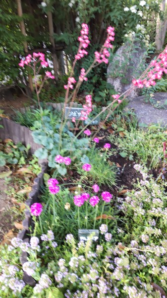 我が家の庭では、紫のシャクナゲやピンクのツボサンゴが咲き、ピンクのラメ入りメダカが元気に泳いでいます。